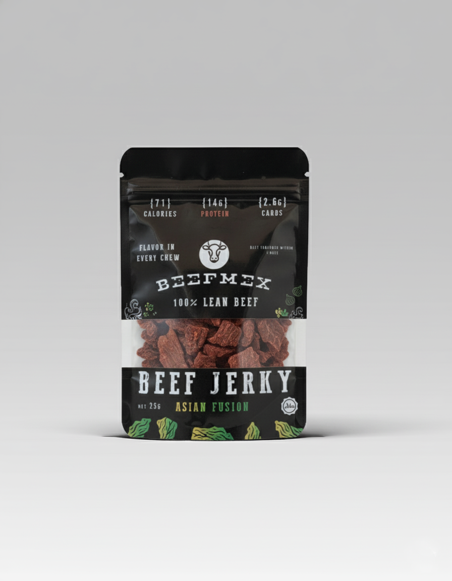 Discover a bold new twist with BeefMex Asian Fusion β a 25g pack of 100% halal lean beef, crafted with a bold harmony of sweet heat and savory depth, inspired by the vibrant street flavors of Asia